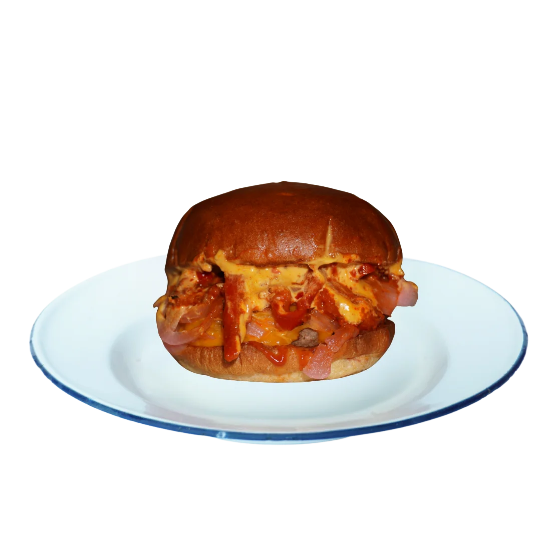 Beef Patty, Cheese, Lettuce, Caramelised Onions, Bacon, Ketchup, Smokey P&B Mayo