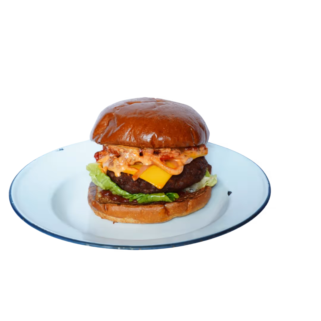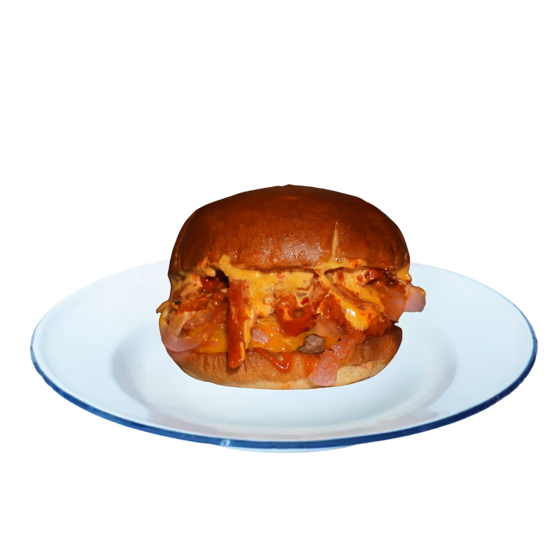 Beef Patty, Cheese, Lettuce, Caramelised Onions, Bacon, Ketchup, Smokey P&B Mayo